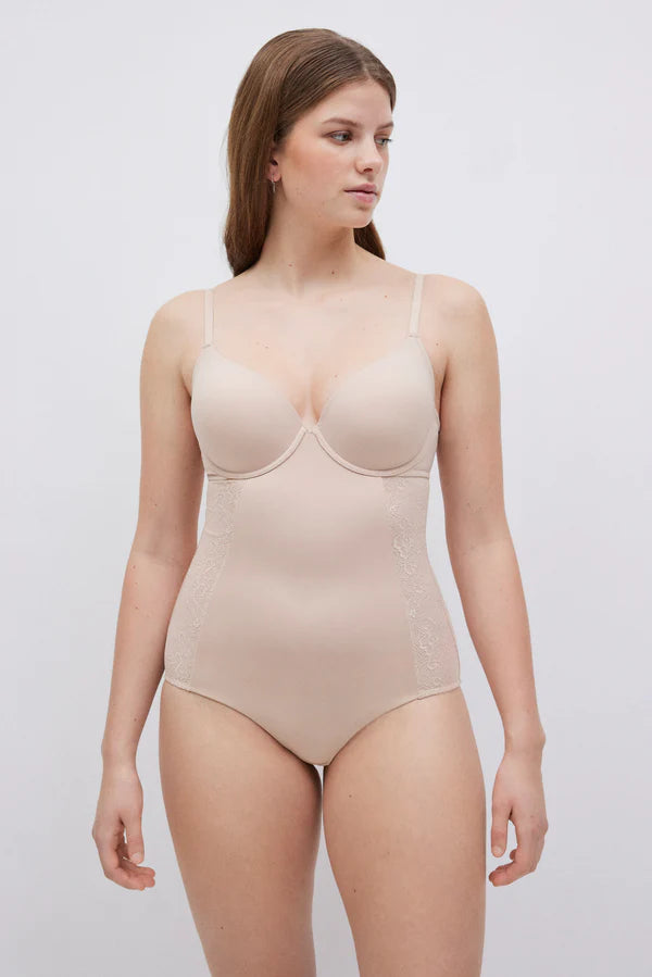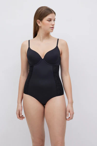 Body redutor em copa C, de média compressão com detalhes em renda nas laterais. É a peça perfeita para aquelas mulheres que querem realçar a sua beleza natural, moldar a sua figura e sentir-se confiantes em qualquer situação.